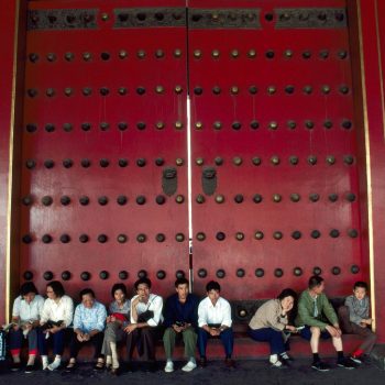 People sitting in front of large doors at the Forbidden City, Beijing, China